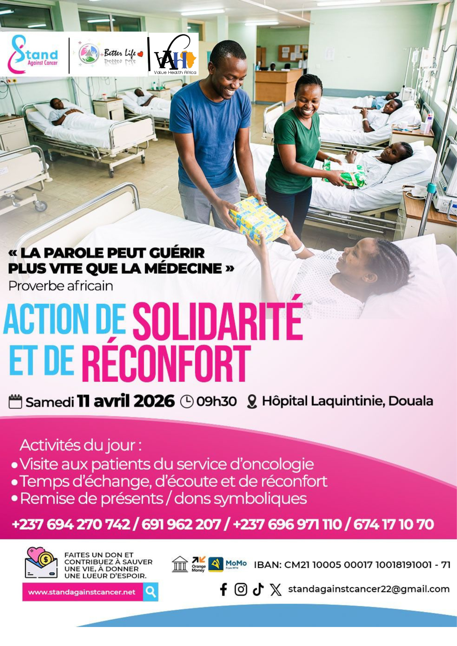 This Saturday, April 11, 2026, at 9:30 AM, Value Health Africa, Stand Against Cancer , and Better life will visit cancer patients in the oncology department of Laquintinie Hospital in Douala: